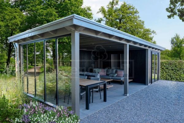 - Uit te breiden met wanden, ramen en glazen schuifwanden