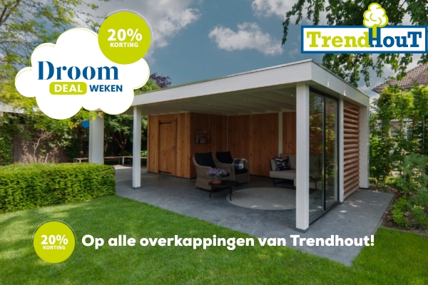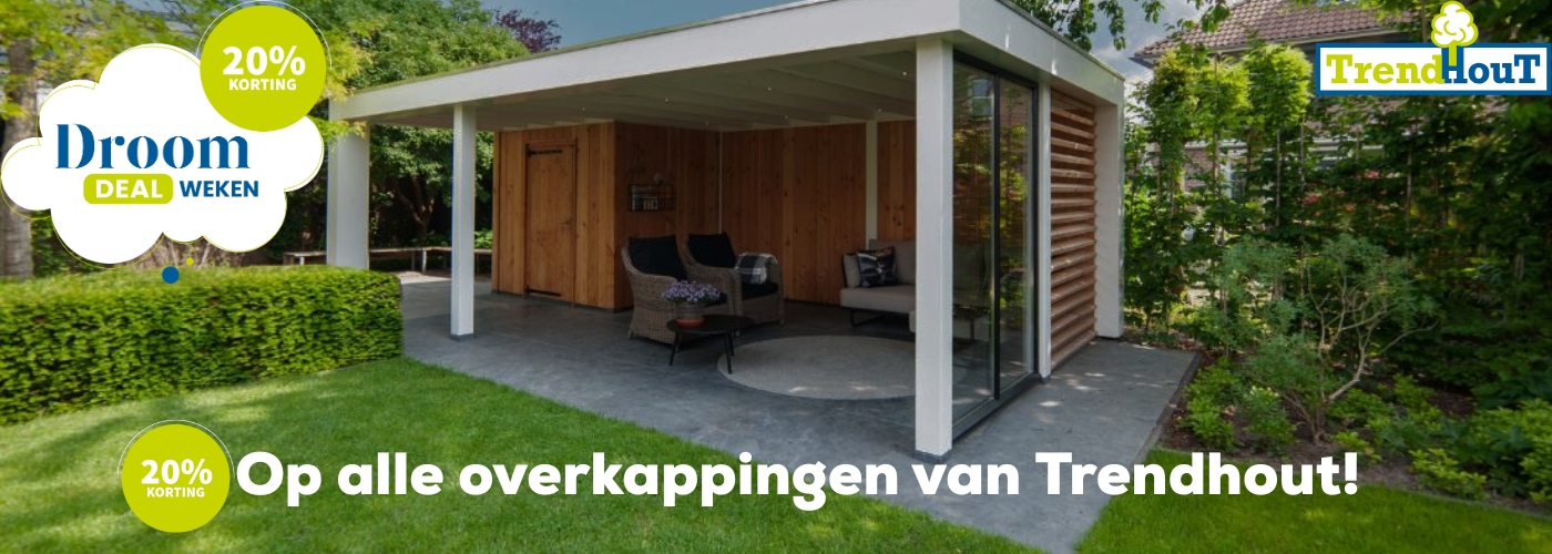 De DroomDealWeken van Trendhout zijn begonnen! Bij Buitenbart krijg je nu 20% korting op alle houten overkappingen en buitenverblijven van Trendhout .Of je nu kiest voor een moderne overkapping met plat dak of een karakteristieke kapschuur, jouw droomplek in de tuin stel je nu extra voordelig samen.