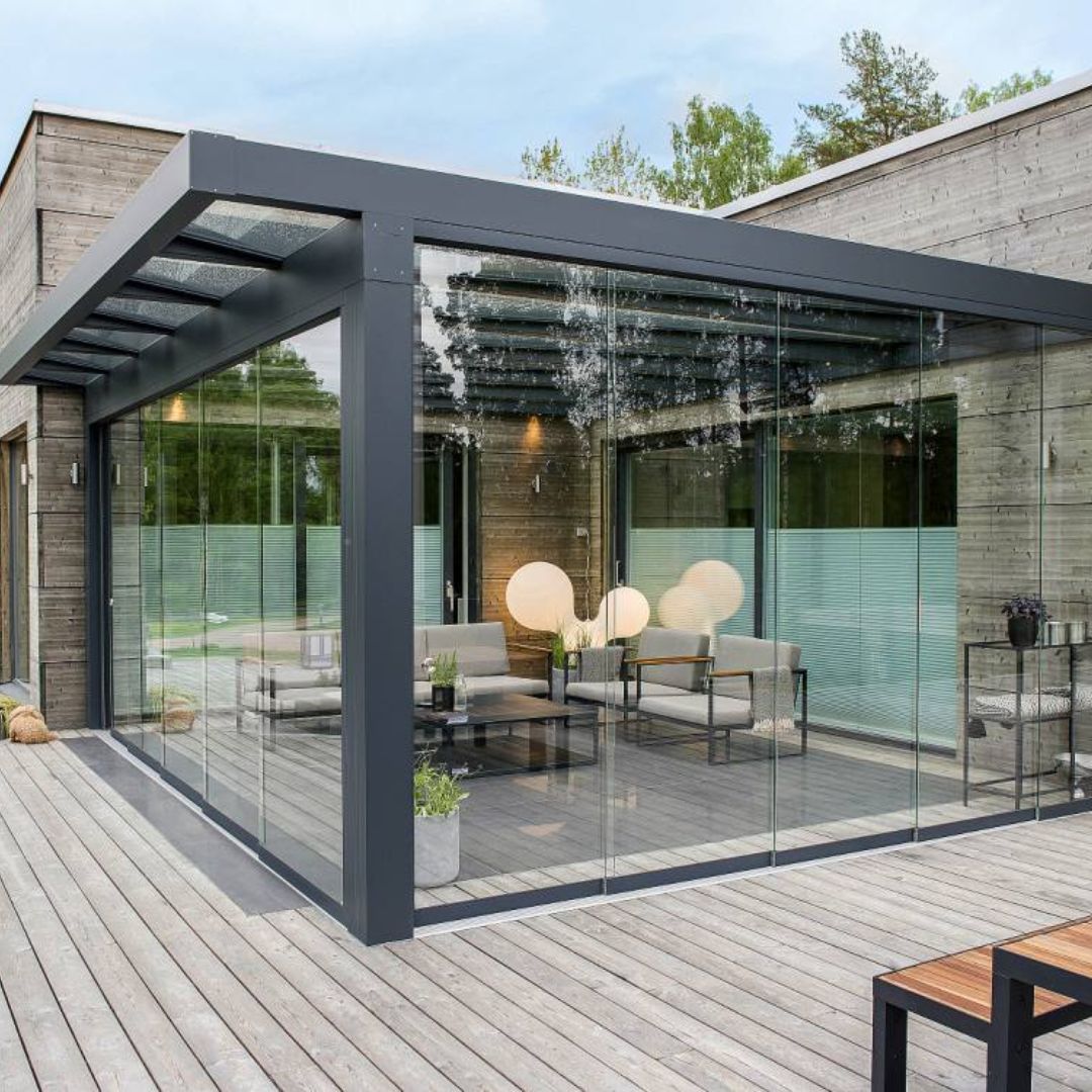 - Wanden en afwerking – Open, gesloten of deels gesloten met glazen schuifwanden.